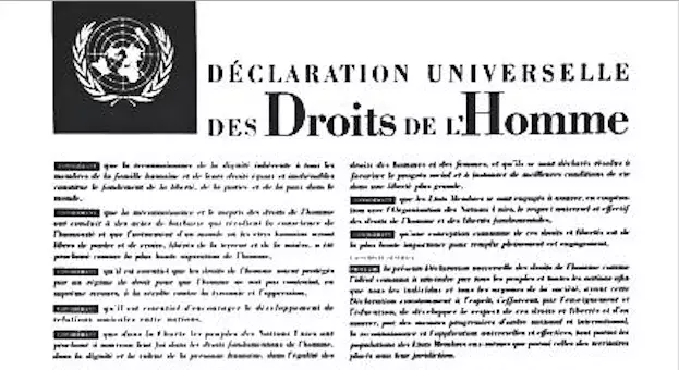 La Déclaration universelle des droits de l’Homme (Universal Declaration of Human Rights en anglais) adoptée par les Nations unies en 1948 est d’essence différente et s’adresse, elle, aux femmes comme aux hommes. Les traducteur.ice.s de la Déclaration en français ont d’ailleurs recouru le plus souvent à des termes autres que « homme » dans le corps du texte pour évoquer les droits conférés, à commencer par l’article premier (« Tous les êtres humains naissent libres et égaux en droit »). Ils et elles n’ont toutefois pas été jusqu’au bout de la démarche.