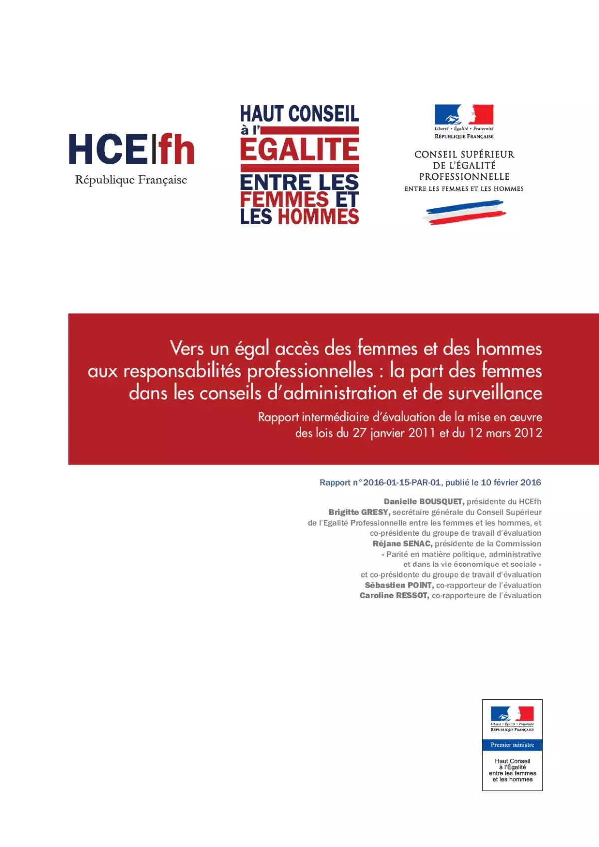 Le 27 janvier 2011 était promulguée la loi fixant un seuil minimal de 40% de femmes ou d’hommes dans les conseils d’administration et de surveillance des grandes entreprises privées et publiques. 5 ans après, et à un an de l’échéance : quel est le bilan ? Que reste-t-il à faire pour s’assurer que les objectifs seront atteints ? Le Haut Conseil à l’Egalité entre les femmes et les hommes (HCEfh) et le Conseil Supérieur à l’Egalité Professionnelle entre les femmes et les hommes (CSEP) dressent un état des lieux et formulent 13 recommandations dans le rapport remis ce jour aux ministres en charge des droits des femmes.