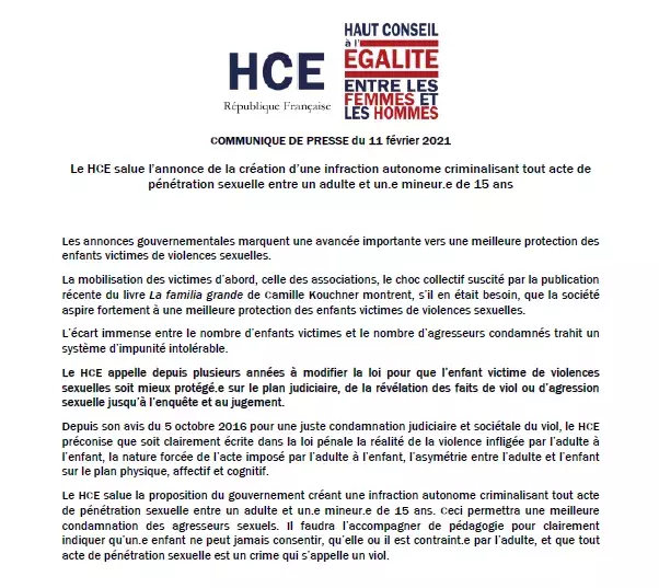 Communiqué de presse - Le HCE salue l’annonce de la création d’une infraction…Le HCE salue l’annonce de la création d’une infraction autonome criminalisant tout acte de pénétration sexuelle entre un adulte… Publié le