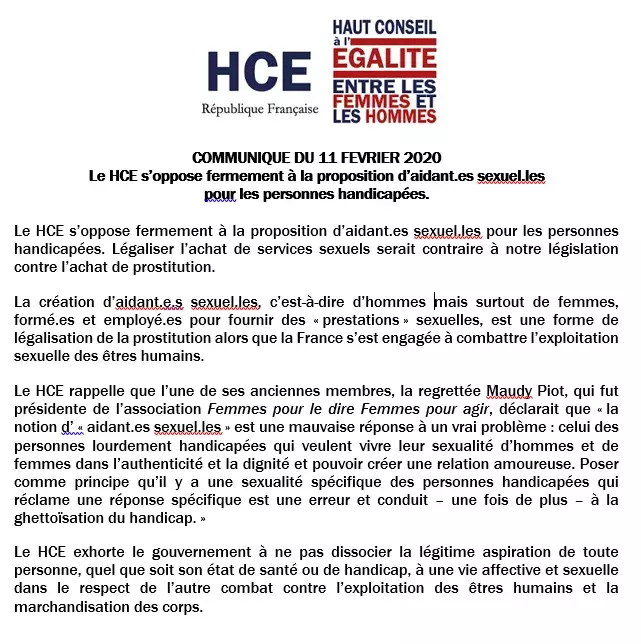 Le HCE s’oppose fermement à la proposition d’aidant.es sexuel.les pour les…COMMUNIQUE DE PRESSE DU 11 FEVRIER 2020Le HCE s’oppose fermement à la proposition d’aidant.es sexuel.les pour les personnes… Publié le