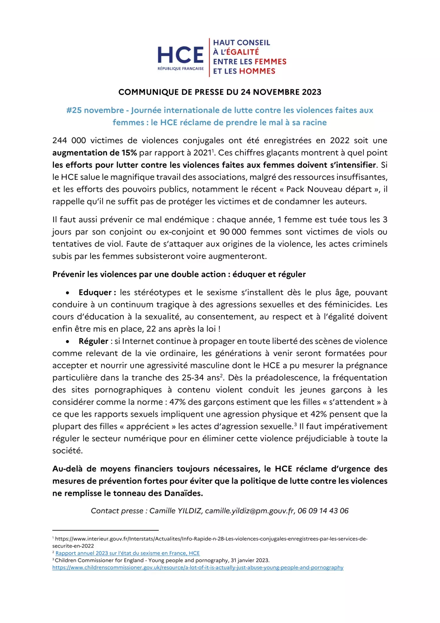 Le Haut Conseil à l’Egalité entre les femmes et les hommes a remis, ce mercredi 27 septembre 2023, son rapport « Pornocriminalité…