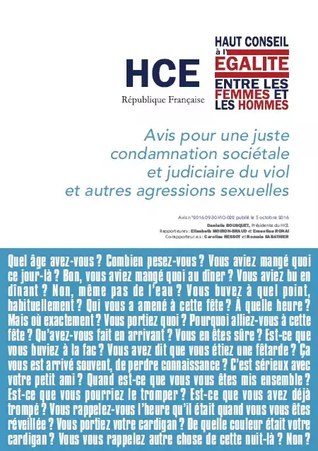 Le 5 octobre, le Haut Conseil à l’Egalité a publié et remis à la Ministre des Familles, de l’Enfance et des Droits des femmes et à la Présidente de la Délégation aux droits des femmes et à l’égalité de l’Assemblée nationale, son Avis pour une juste condamnation sociétale et judiciaire du viol et autres agressions sexuelles.