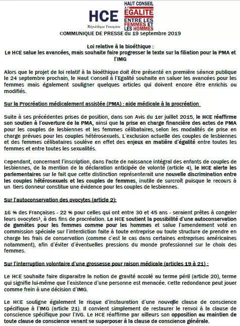 CP - Loi relative à la bioéthique : Le HCE salue les avancées, mais souhaite…