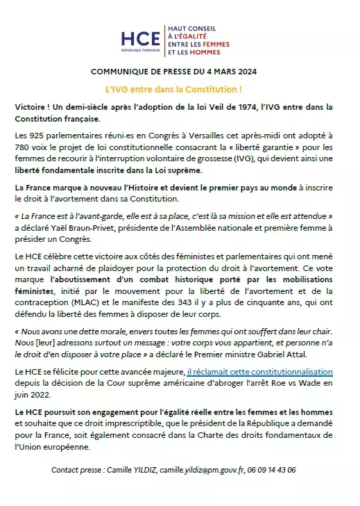 Les 925 parlementaires réuni·es en Congrès à Versailles cet après-midi ont adopté le projet de loi constitutionnelle consacrant la « liberté garantie » pour les femmes de recourir à l’interruption volontaire de grossesse (IVG), qui devient ainsi une liberté fondamentale inscrite dans la Loi suprême.